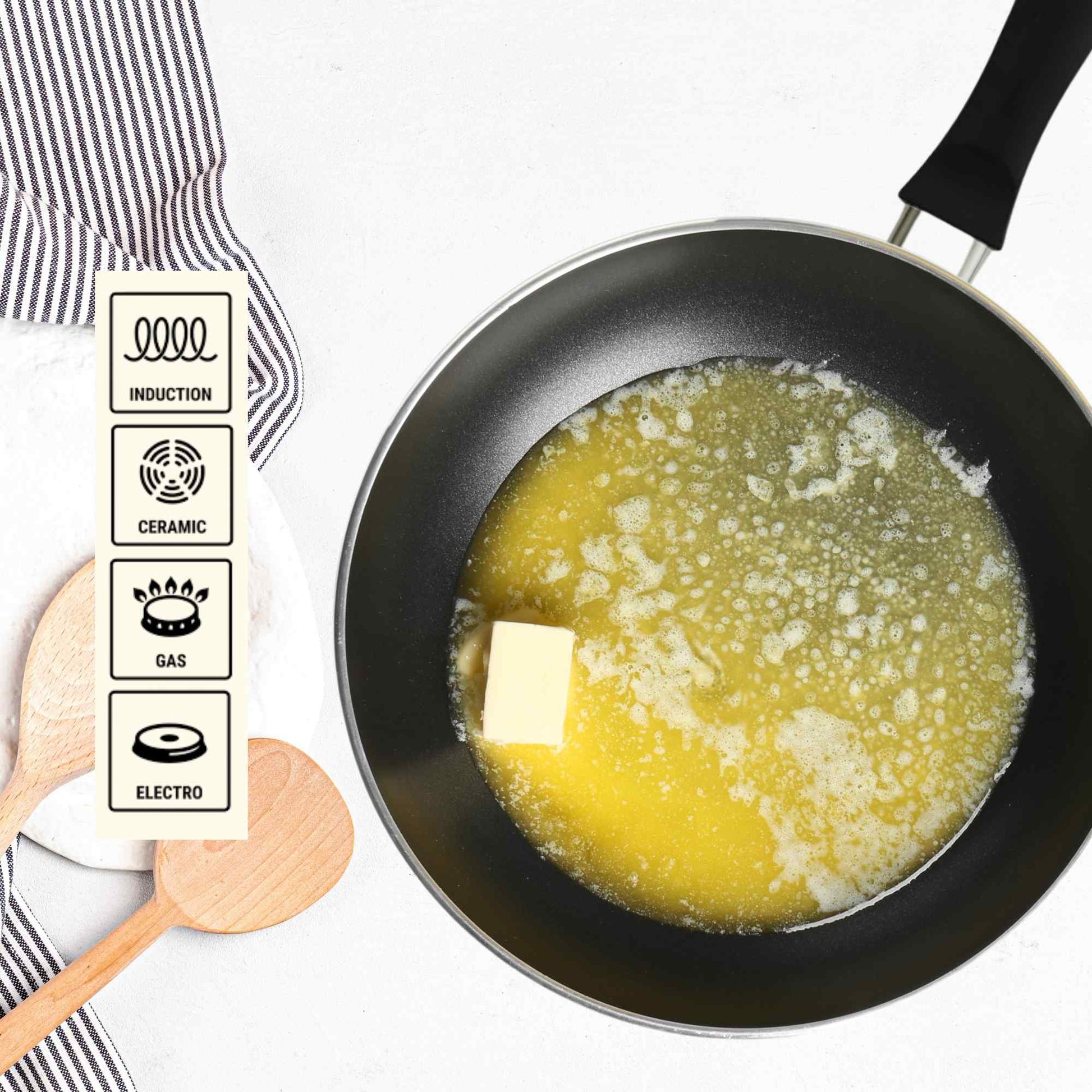 This pan is made from aluminum which ensures both quality and durability. Non-stick interior. The curved handle allows for easy handling of the pan and provides a comfortable grip. Suitable for all stove tops including induction.
